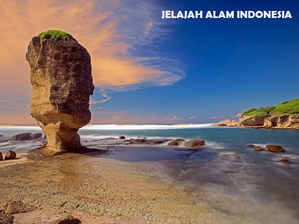 Batu ikonik berdiri megah di dekat bibir pantai dengan bentuk menyerupai payung raksasa. Karang tersebut terlihat unik karena erosi angin dan ombak terus mengikis bagian bawahnya. Proses alami itu menciptakan bentuk dramatik yang jarang ditemukan di pantai lain. Banyak fotografer menyukai struktur tersebut karena bentuknya memberi fokus kuat pada setiap foto.